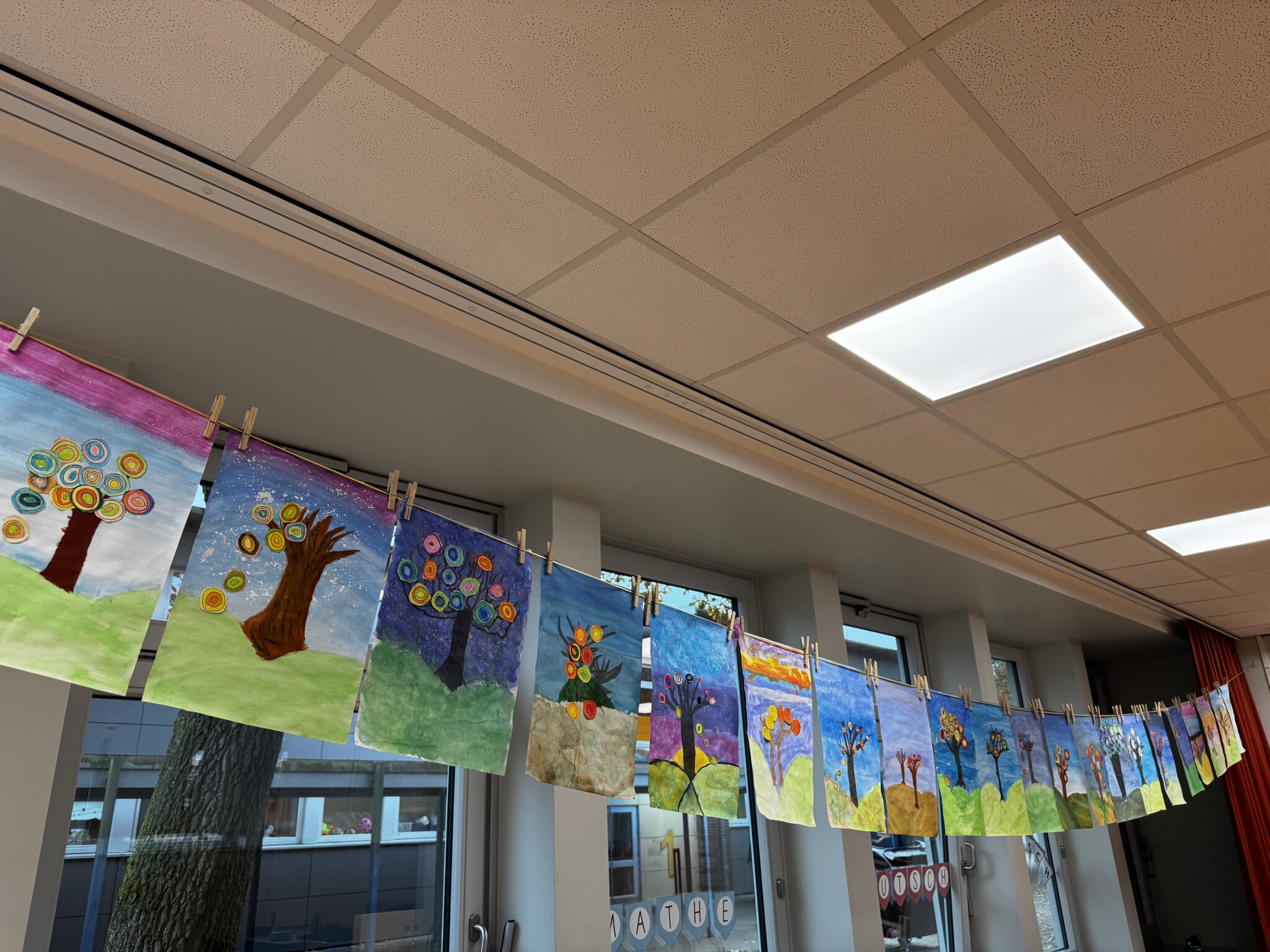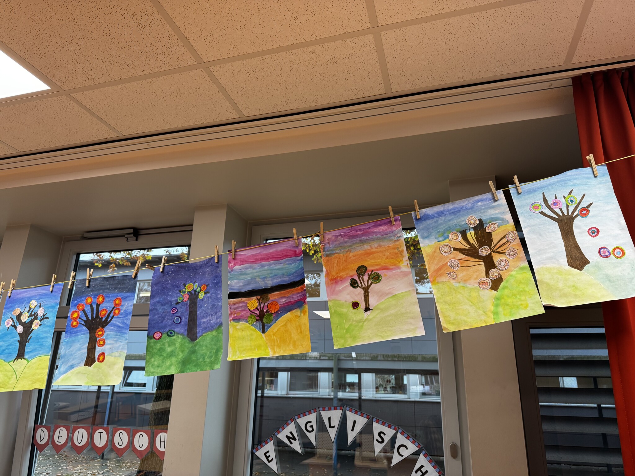 Aus einer Bildbetrachtung wurde ein spannendes, philosophisches Gespräch und schnell haben die Kinder festgestellt, dass expressionistische Kunst vielseitig gedeutet und betrachtet werden kann. Insbesondere Kreise und Punkte können in der Kunst Unterschiedliches darstellen. So machten sich die Kinder ran, diese in ihre herbstlichen Bilder einzubauen. Als bunte Blätter, die von Bäumen fallen, haben die Kinder zunächst Herbstfarben ausgemacht und dann losgelegt. Die Ergebnisse können sich sehen lassen und lassen den Herbst auch in unser Klassenzimmer einziehen 🙂
